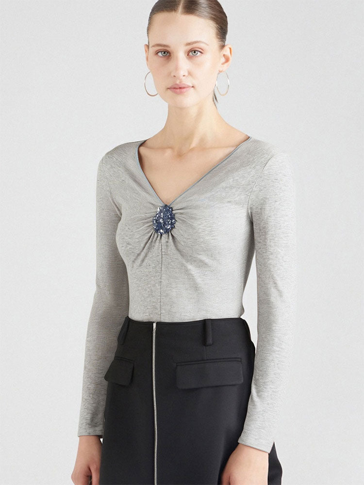 Grey Corsage V Neck Full Sleeves Fitted Top