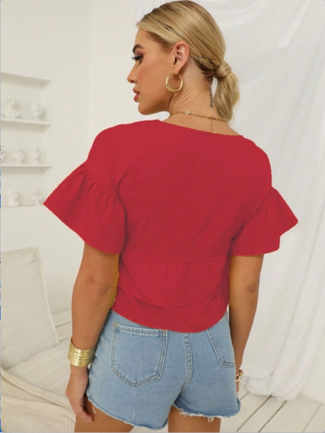 Slip into the Red Ruffle Hem Peplum Top for a laid-back day that still looks styled. Whether you're heading out or staying in, this vacay wear is built for that Gen Z mix of comfort and edge. The red color makes it pop, and the relaxed fit means it feels as good as it looks.