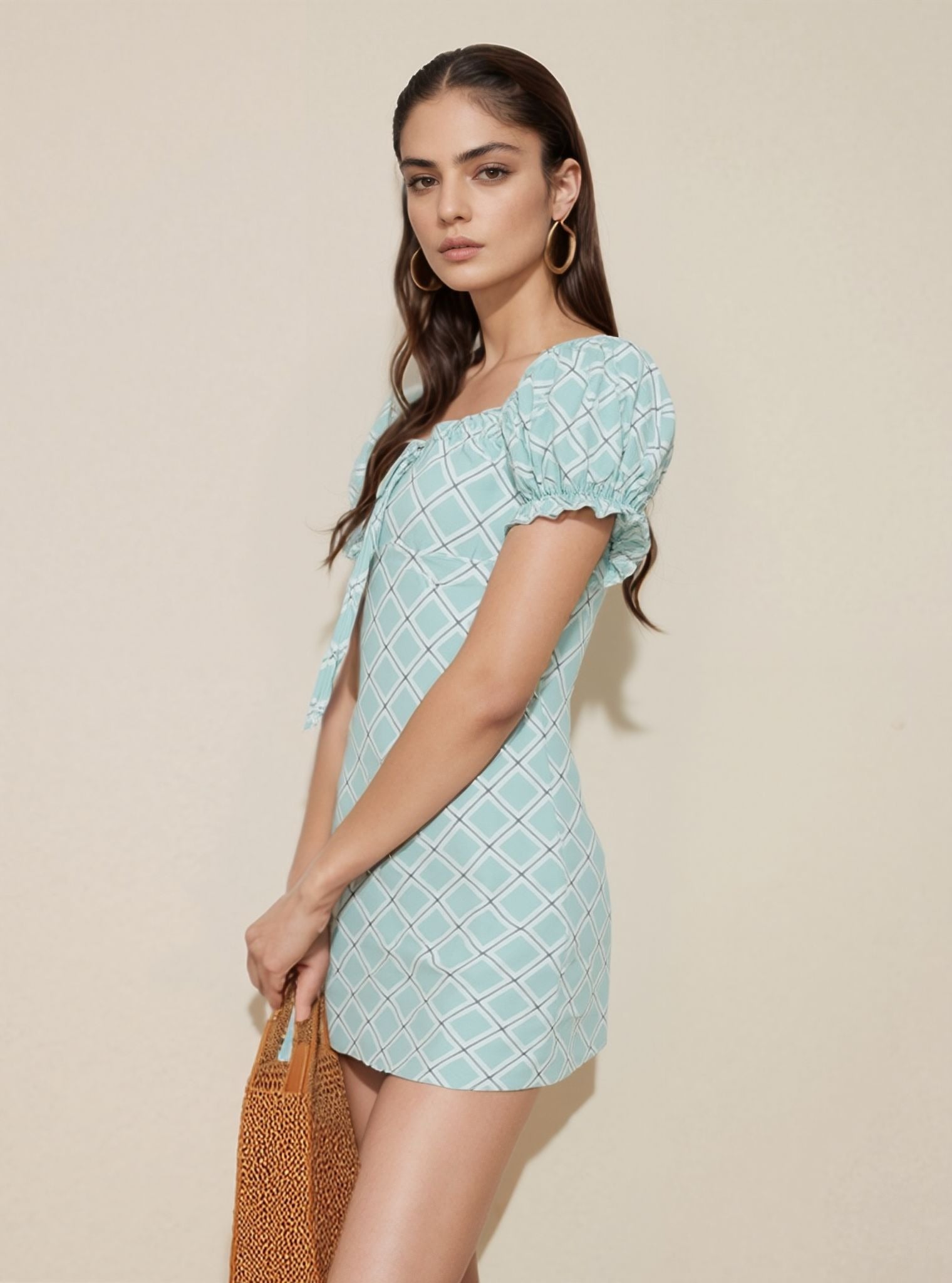 This is a fitted, mini-length dress featuring a charming light mint green fabric adorned with a subtle diamond pattern in white. The dress has a square neckline and short puff sleeves, giving it a playful and feminine vibe. A delicate tie detail is present at the center front, enhancing the neckline. The overall design emphasizes a snug silhouette, making it suitable for casual outings or summer events. The soft texture of the fabric contributes to a comfortable fit. 锟斤拷 锟斤拷