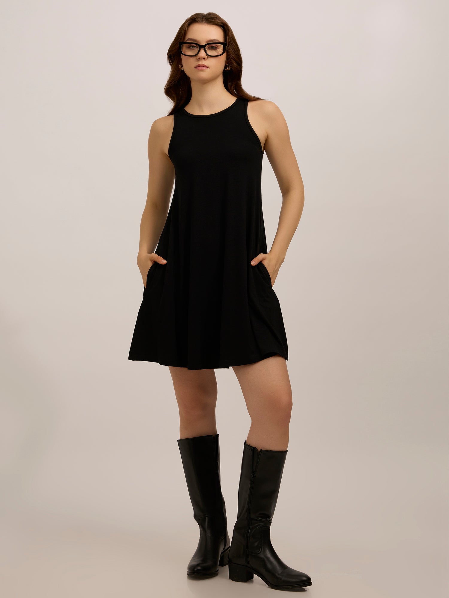 Black Solid Flowy Mini Dress fits your schedule. It’s a a-line mini dress made for going-out days. Throw on a denim jacket or wear it solo,it works both ways. Its black tone blends into your wardrobe while still standing out. Easy to wear, easy to love.
