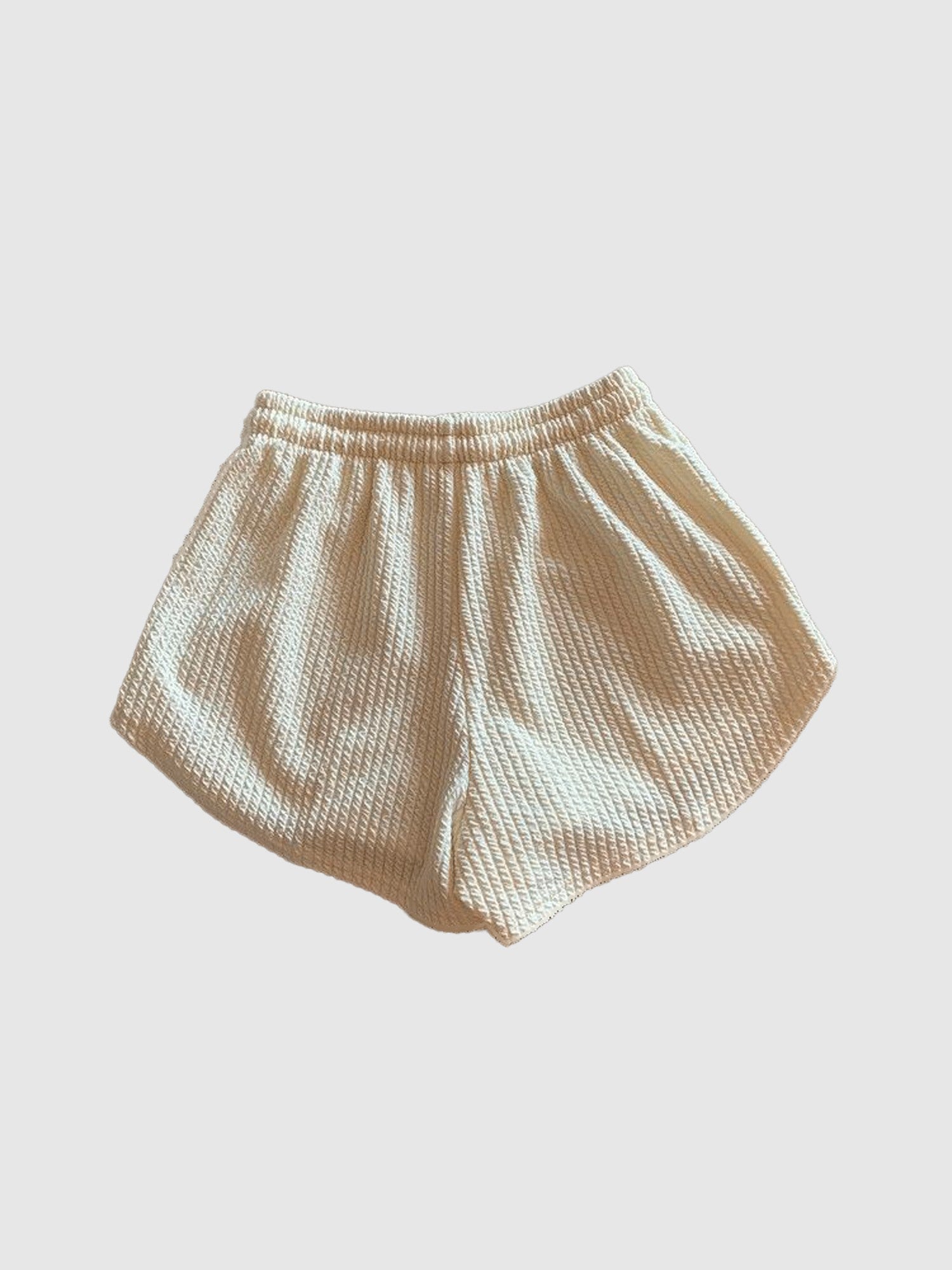Soft, cream-colored knit shorts designed for comfort and style. Perfect for casual streetwear, they offer a relaxed fit and breathable fabric, making them ideal for warm days or lounging. With a textured knit finish, these shorts combine everyday ease with a trendy look, making them a must-have addition to your wardrobe. Versatile for pairing with any top, they锟斤拷锟絩e the ultimate in laid-back fashion.