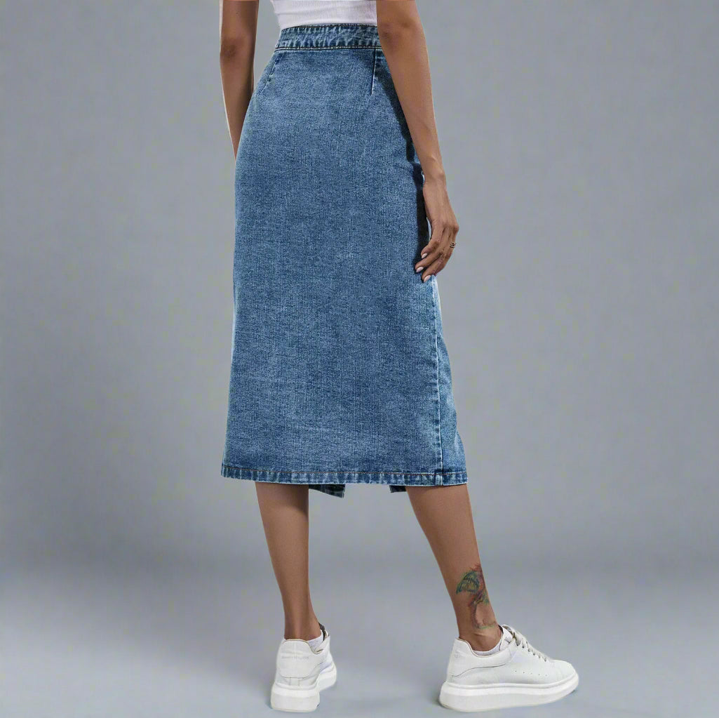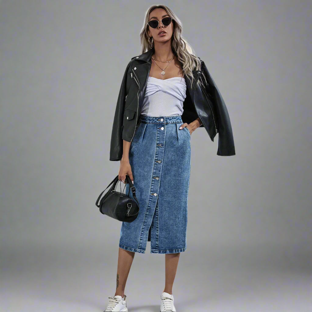 Blue Button Down Denim Skirt was made with your street wear calendar in mind. Casual. Cool. Kind of unstoppable. Get dressed, get out.
