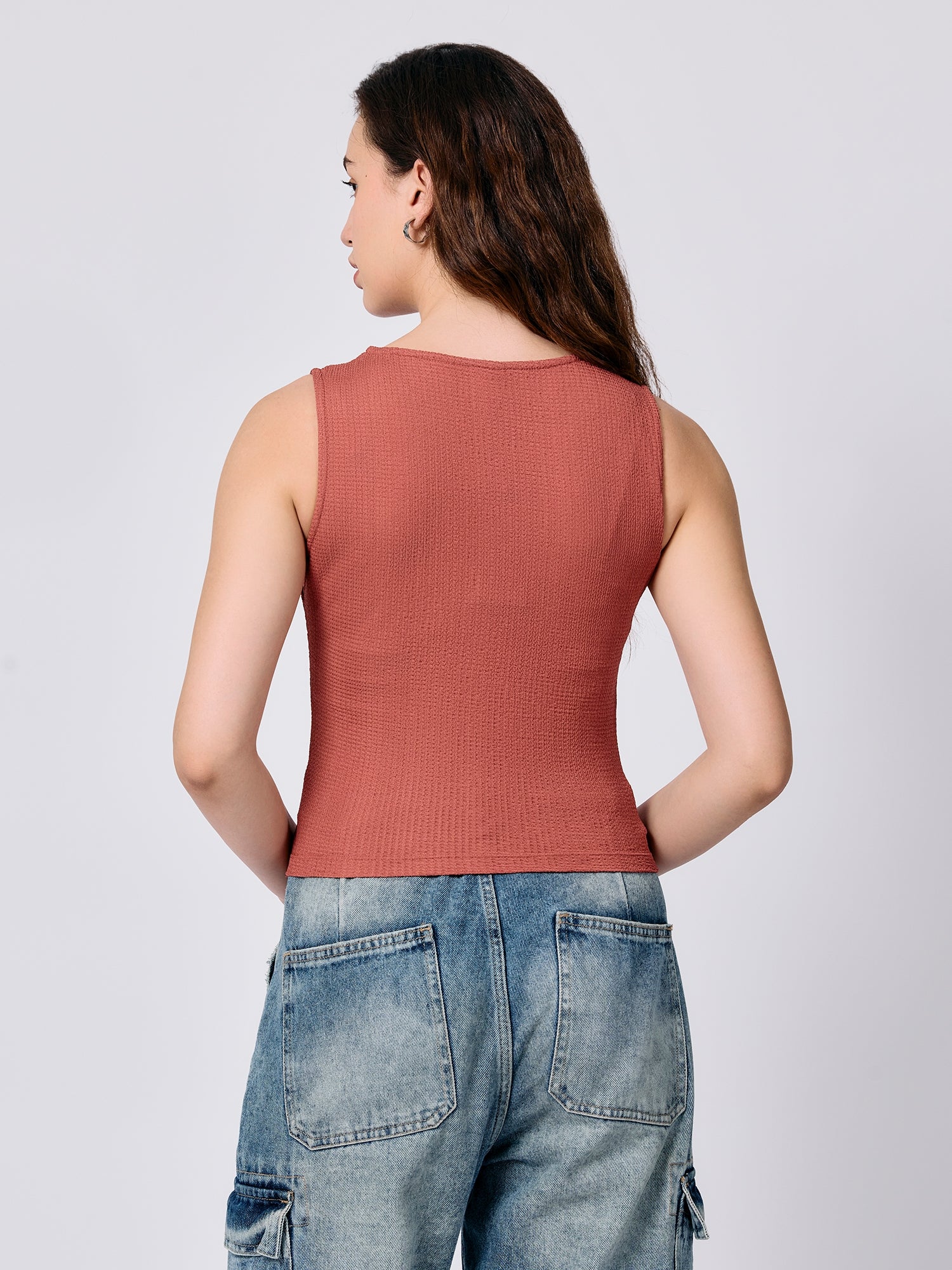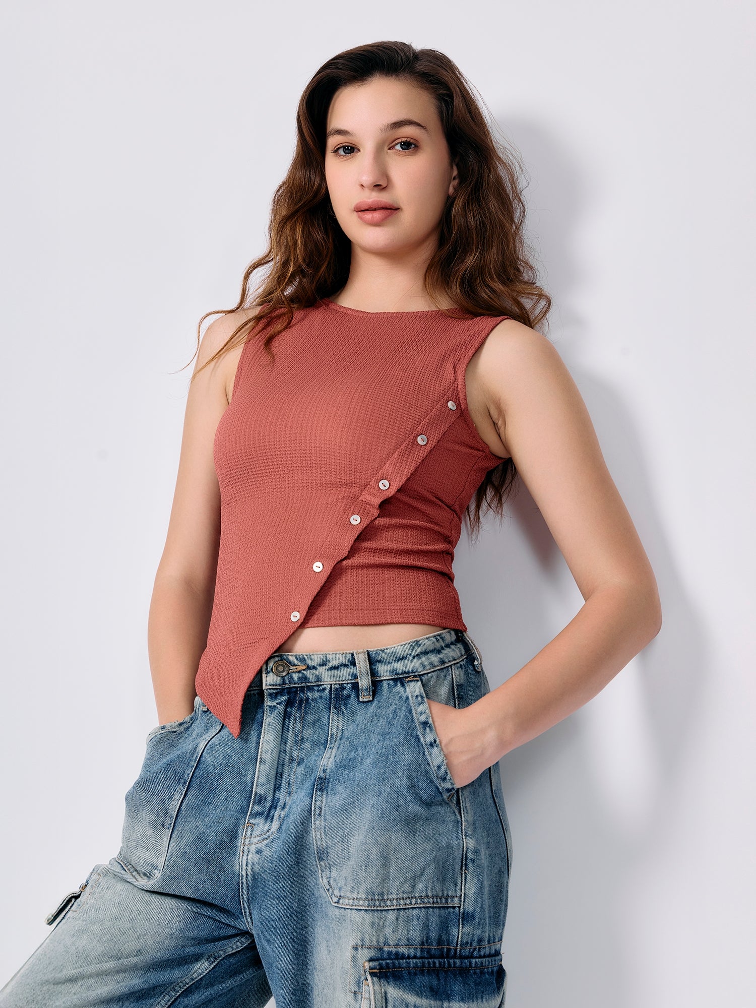 The Coral Textured Assymetric Hem Tank is built for real plans and real movement. this casual wear transitions easily from daywear to after-dark fits. Finished with attention to ease and flow.