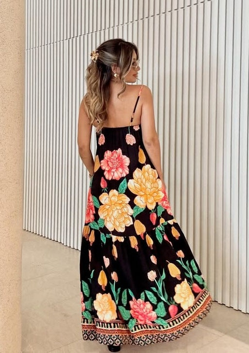 Navy Blue Spaghetti Strap Floral Printed Dress