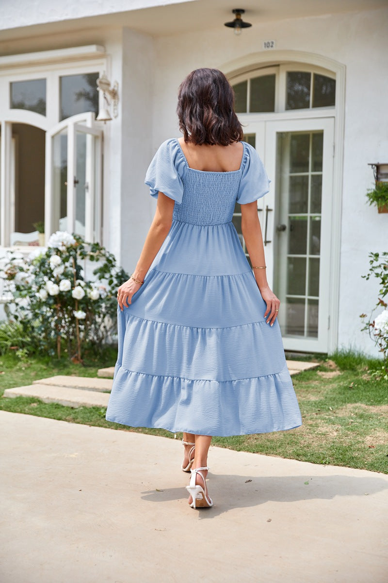 Blue Square Neck Puff Sleeved Tiered Dress