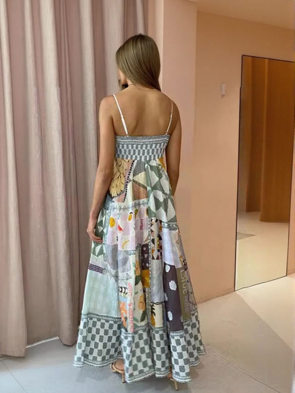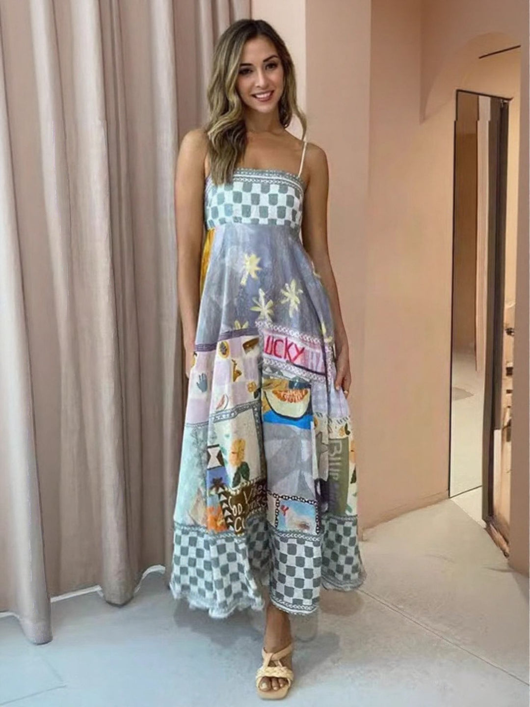 Yellow Shoulder Strap Waist Cut-Out Printed Dress