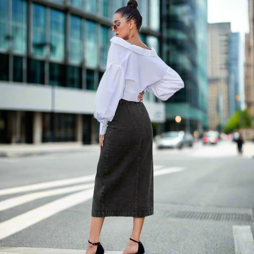 Built for movement and mood, Black Side Button Down Denim Skirt nails street wear dressing without the drama. You’re welcome. Get dressed, get out.