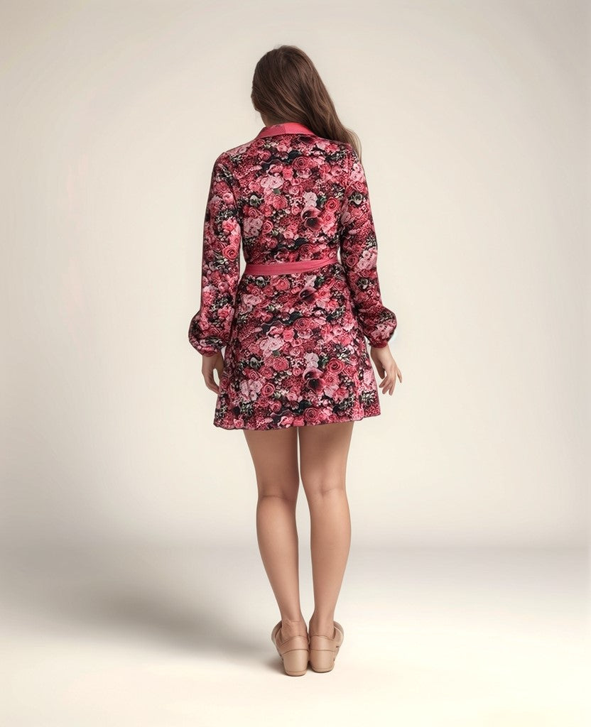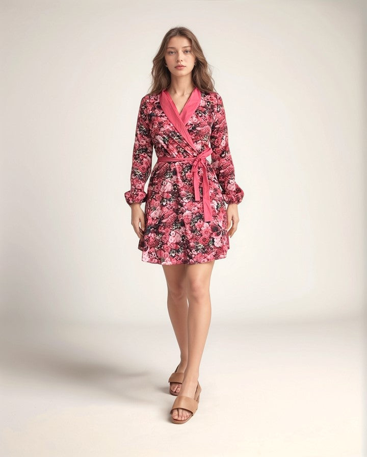 Printed Wrap Pink Dress With Shawl Collar