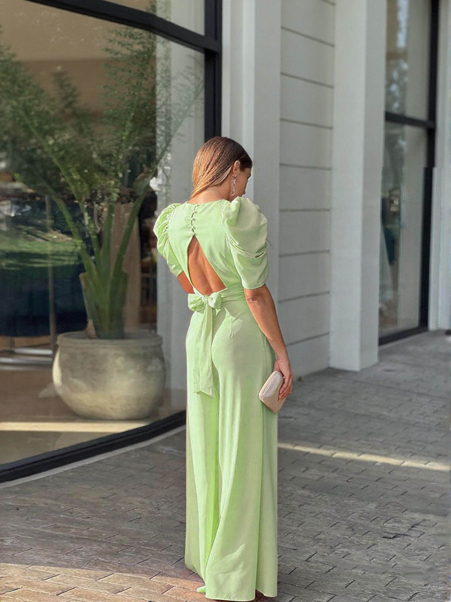 Green Shoulder Cut Out With High Slit Maxi Dress