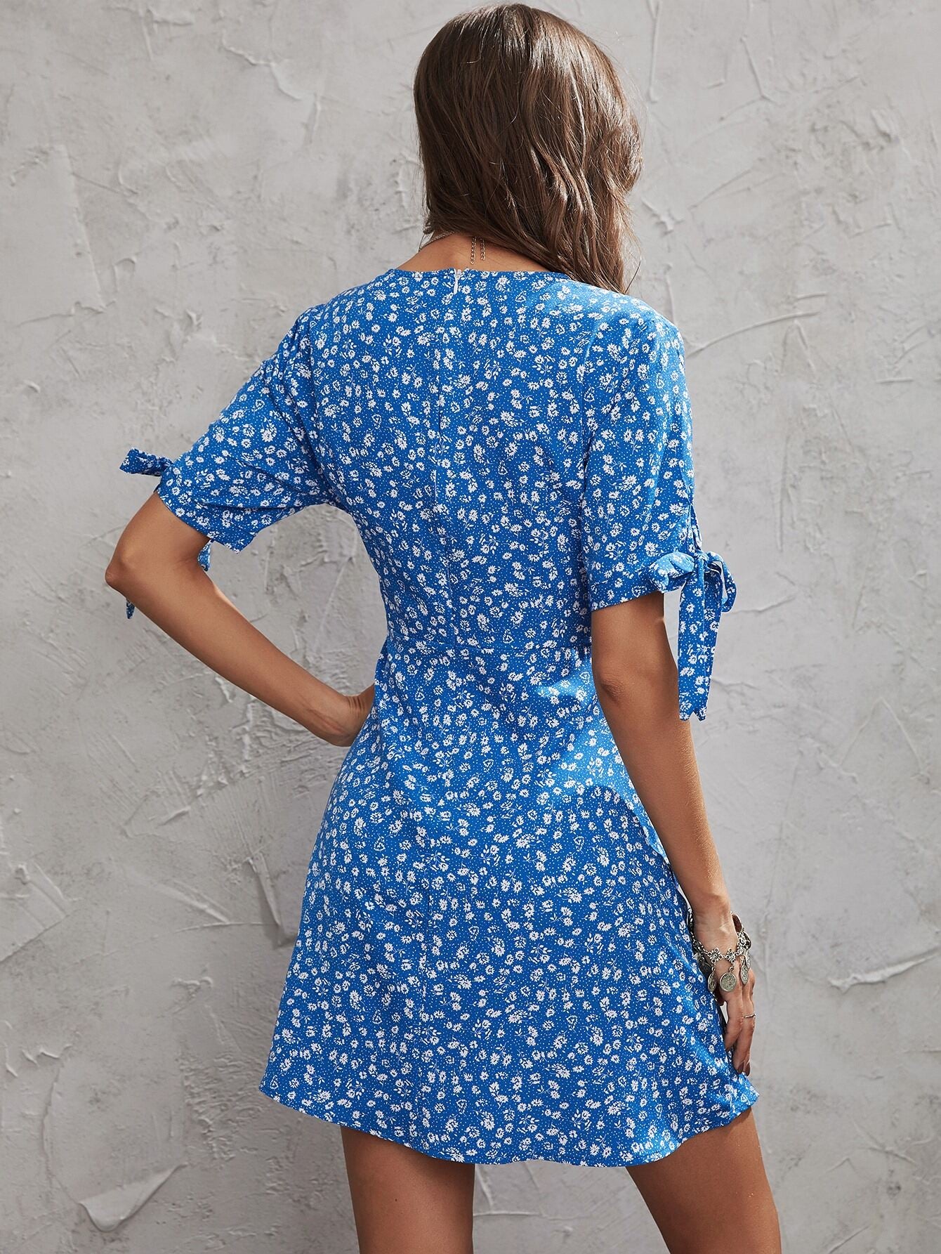 Blue V Neck Fit And Flare Ditsy Print Mini Dress