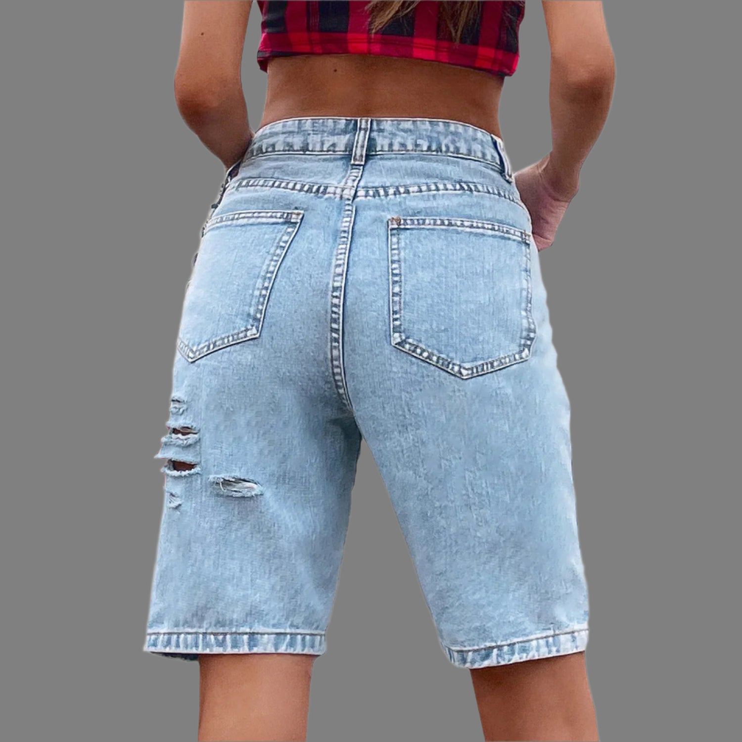Light Blue Bermuda Denim Shorts With Freyed Hem