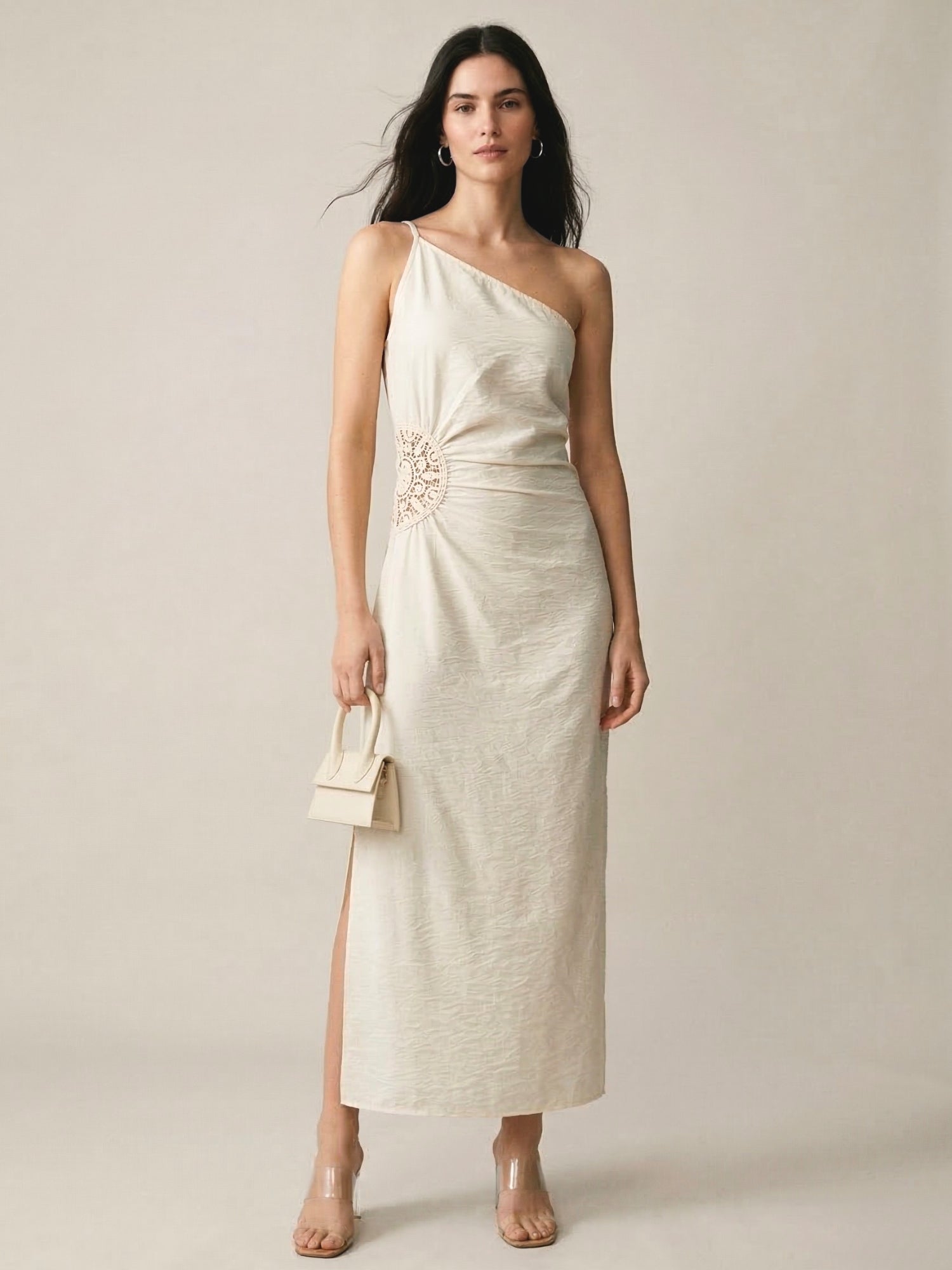 Experience modern grace in this white maxi dress featuring delicate side lace details. The sophisticated lace fabric and graceful silhouette make it an ideal selection for bridal showers or beach weddings. This dress radiates contemporary charm and provides a truly polished appearance for garden parties and graduation ceremonies.