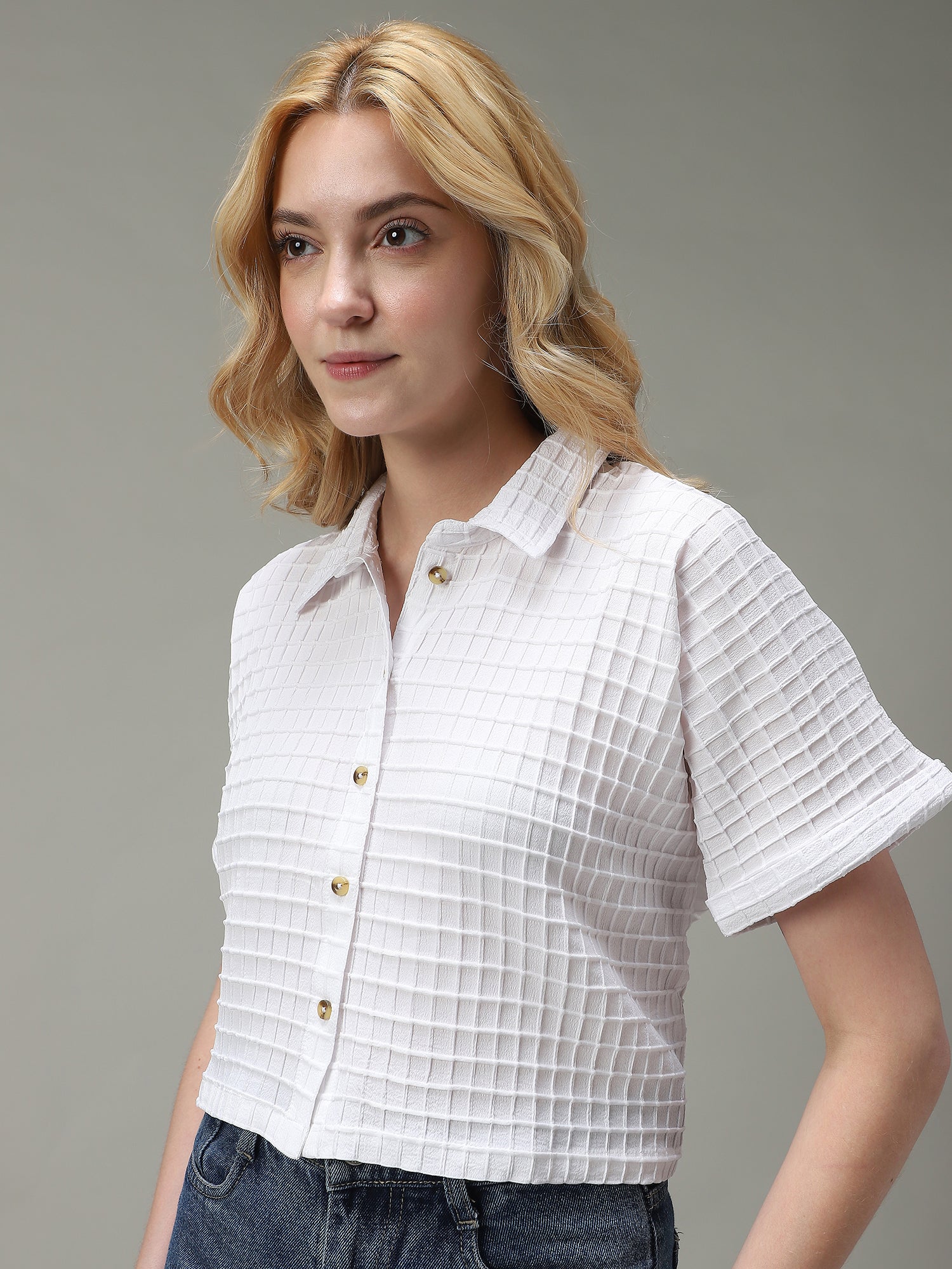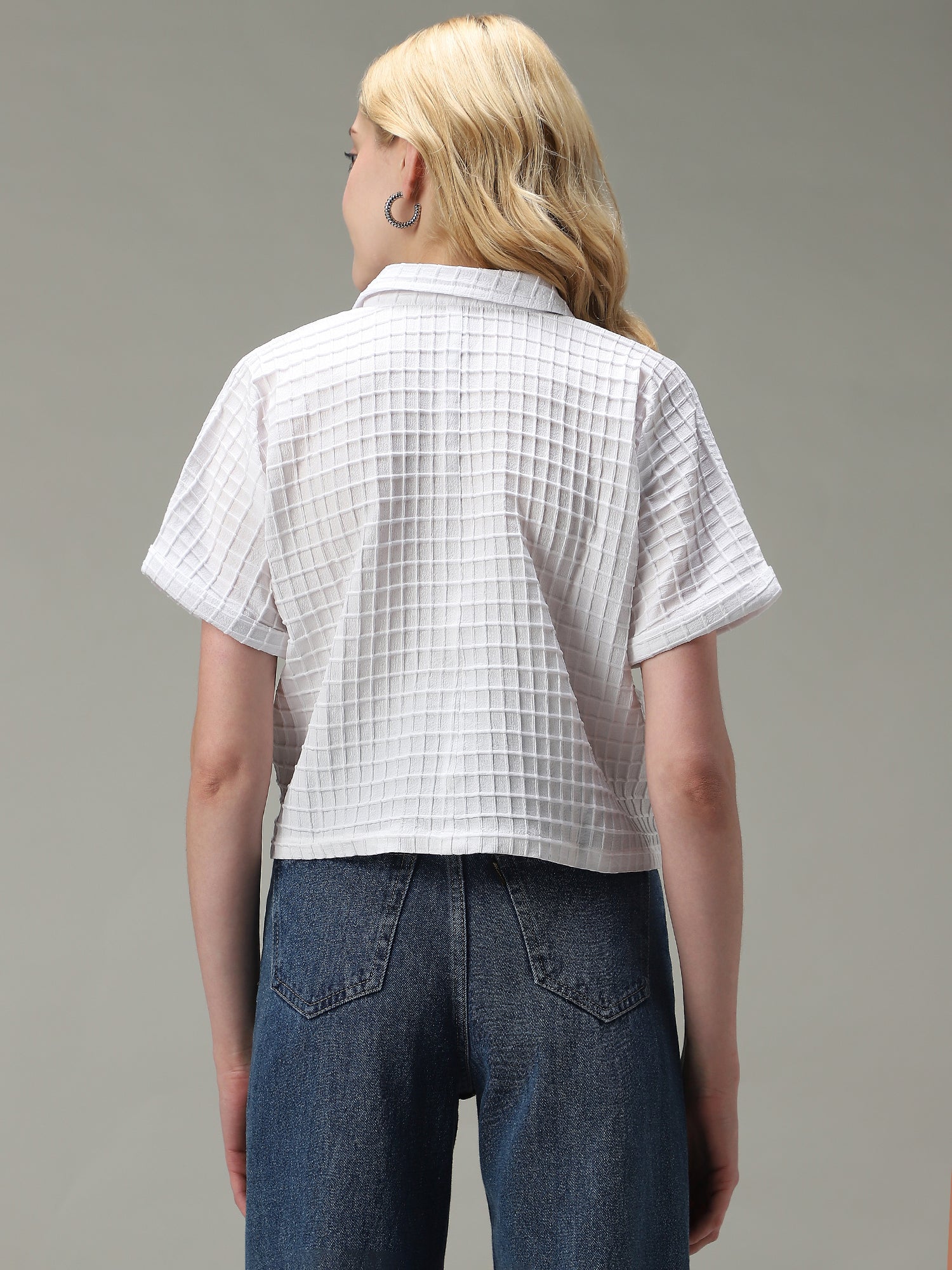 This white cropped shirt features a subtle yet modern print that adds character to your look. An excellent choice for college wear or a casual outing with friends. Its trendy cropped fit also makes it suitable for a fun night out.