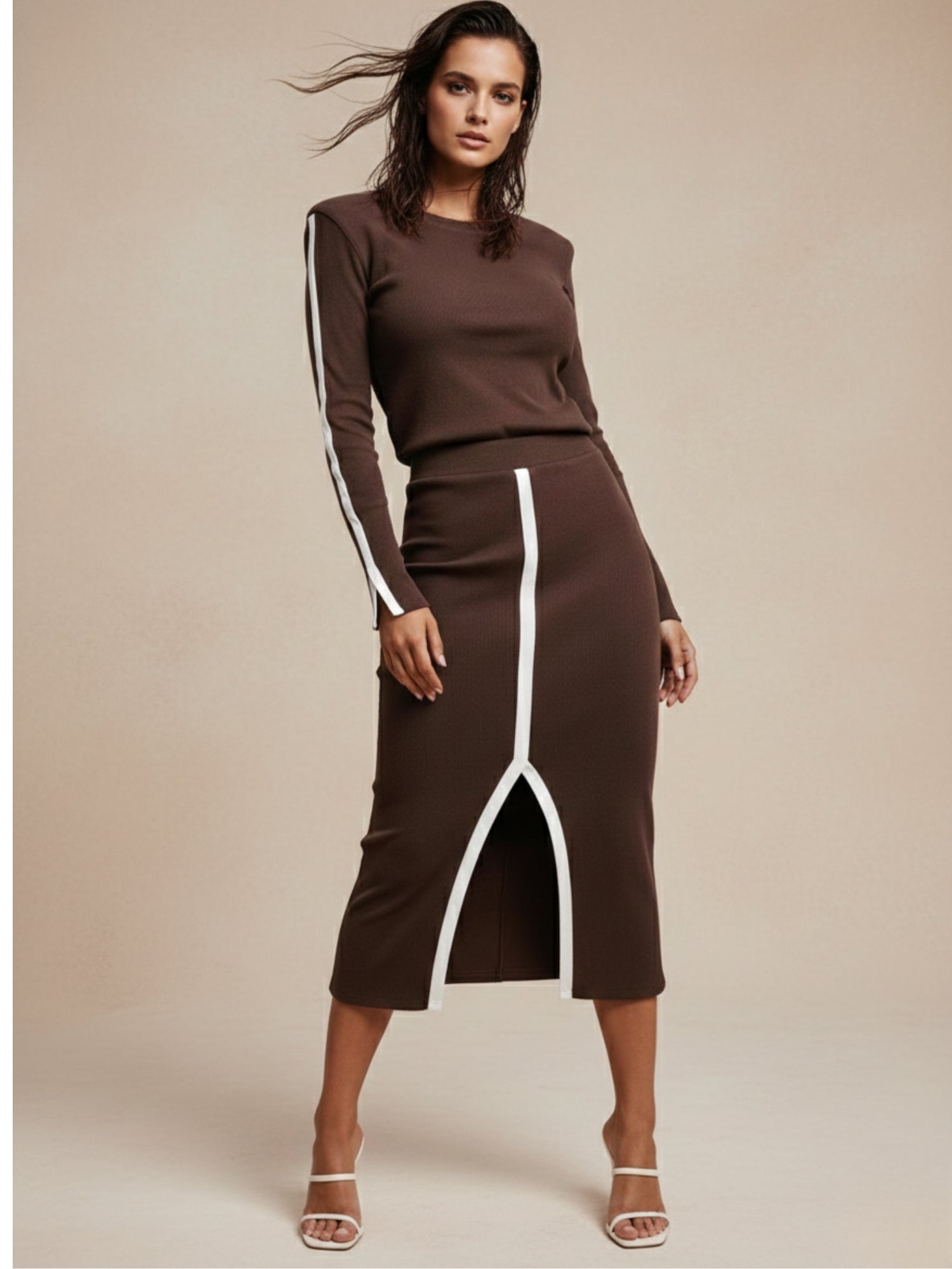 This sophisticated brown long sleeve skirt set is a masterclass in minimalist elegance. The rich autumn tone and cozy knit fabric offer a sharp, authoritative presence perfect for gallery visits or evening socials. Pair with leather boots for a polished appearance that transitions effortlessly from a professional lunch to a romantic dinner date.
