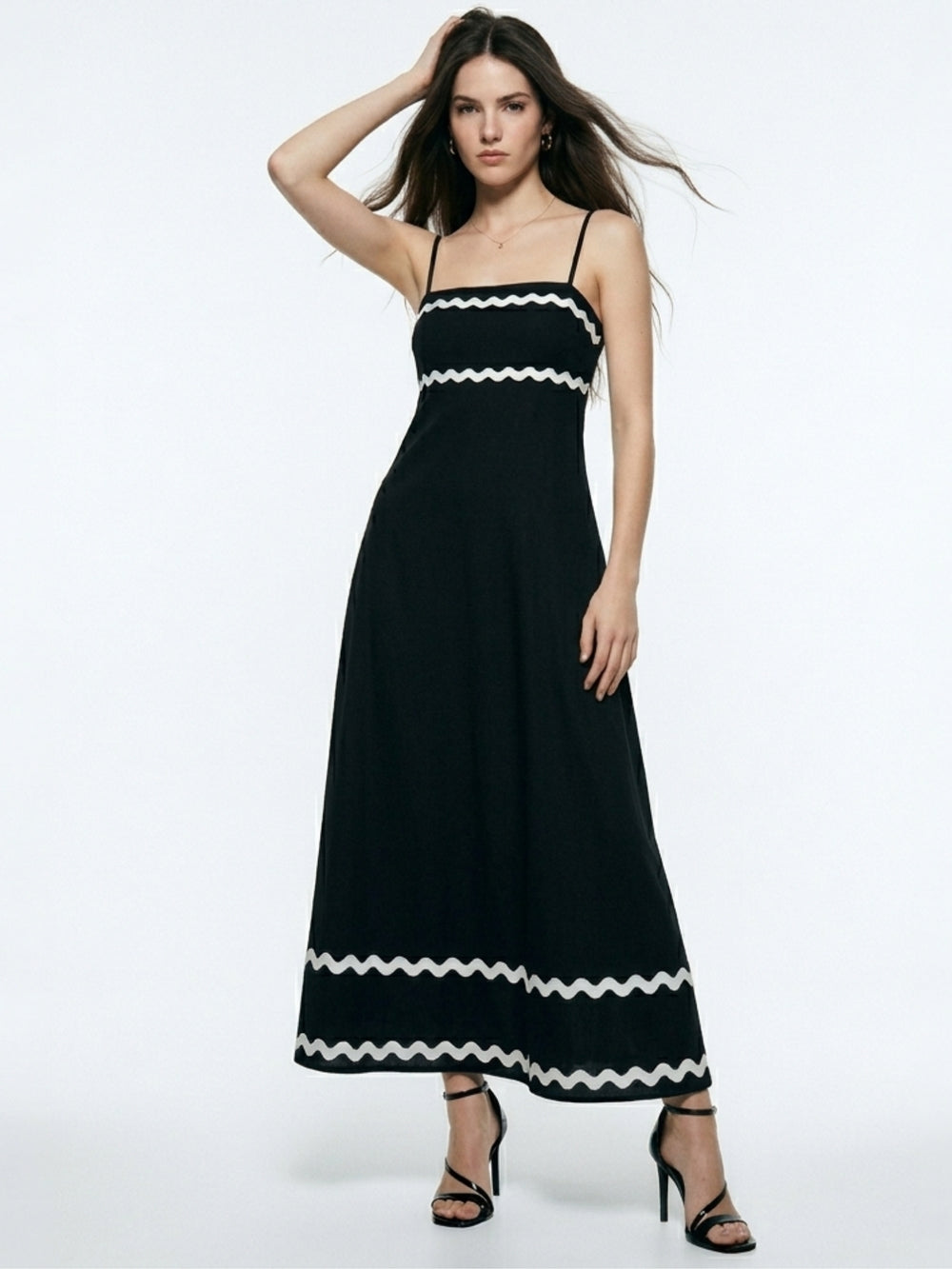 Achieve a masterclass in sophistication with this black noodle strap contrast patterned dress. The elegant noodle strap neckline and modern contrast pattern offer a sharp, authoritative presence perfect for gallery visits or an intimate evening dinner. This elegant evening maxi radiates confidence and commands attention. Combine with silver accessories for a polished, authoritative presence that is truly modern and versatile for any formal social occasion. This contrast printed dress ensures you look stunning and sophisticated for every anniversary celebration or special gala event in your evening rotation.