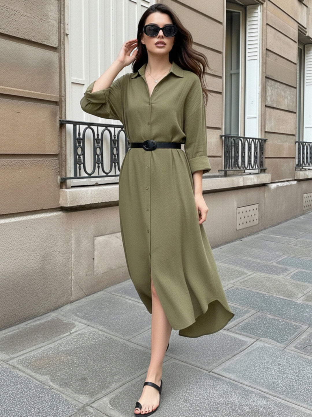 Stay effortlessly stylish in this olive longline button-down shirt dress. Designed for comfort, this olive western wear piece is ideal for travel or outdoor strolls. It serves as a reliable option for casual Fridays at work or relaxed coffee dates with friends.