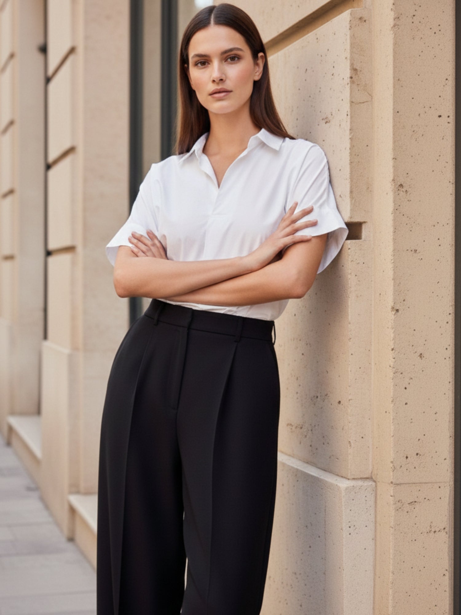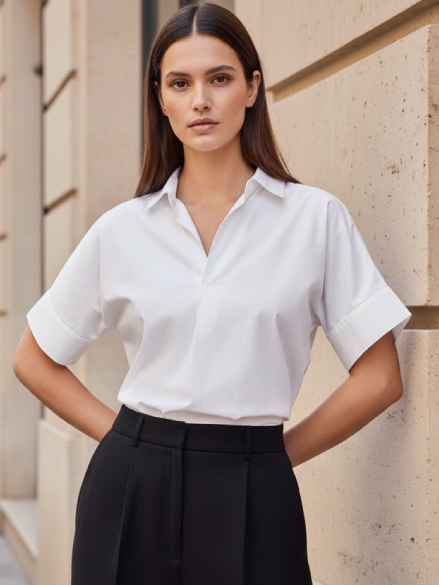 Elevate your neutrals with this white and beige boxy shirt. Featuring rolled short sleeves, this minimal chic blouse is perfect for a professional office look or a relaxed weekend brunch. A breathable summer shirt ideal for daily errands.