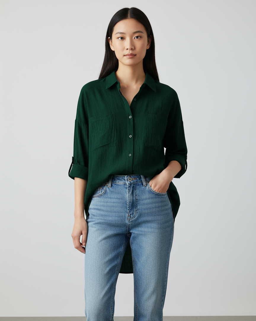 This teal oversized longline shirt is a masterclass in relaxed style. Its longline silhouette makes it a cozy choice for winter daily wear or travel. Pair this versatile utility top with leggings or skinny jeans for effortless casual outings.
