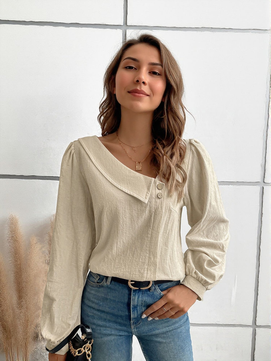Beige Full Sleeve Top With Asymetric Neck Detail