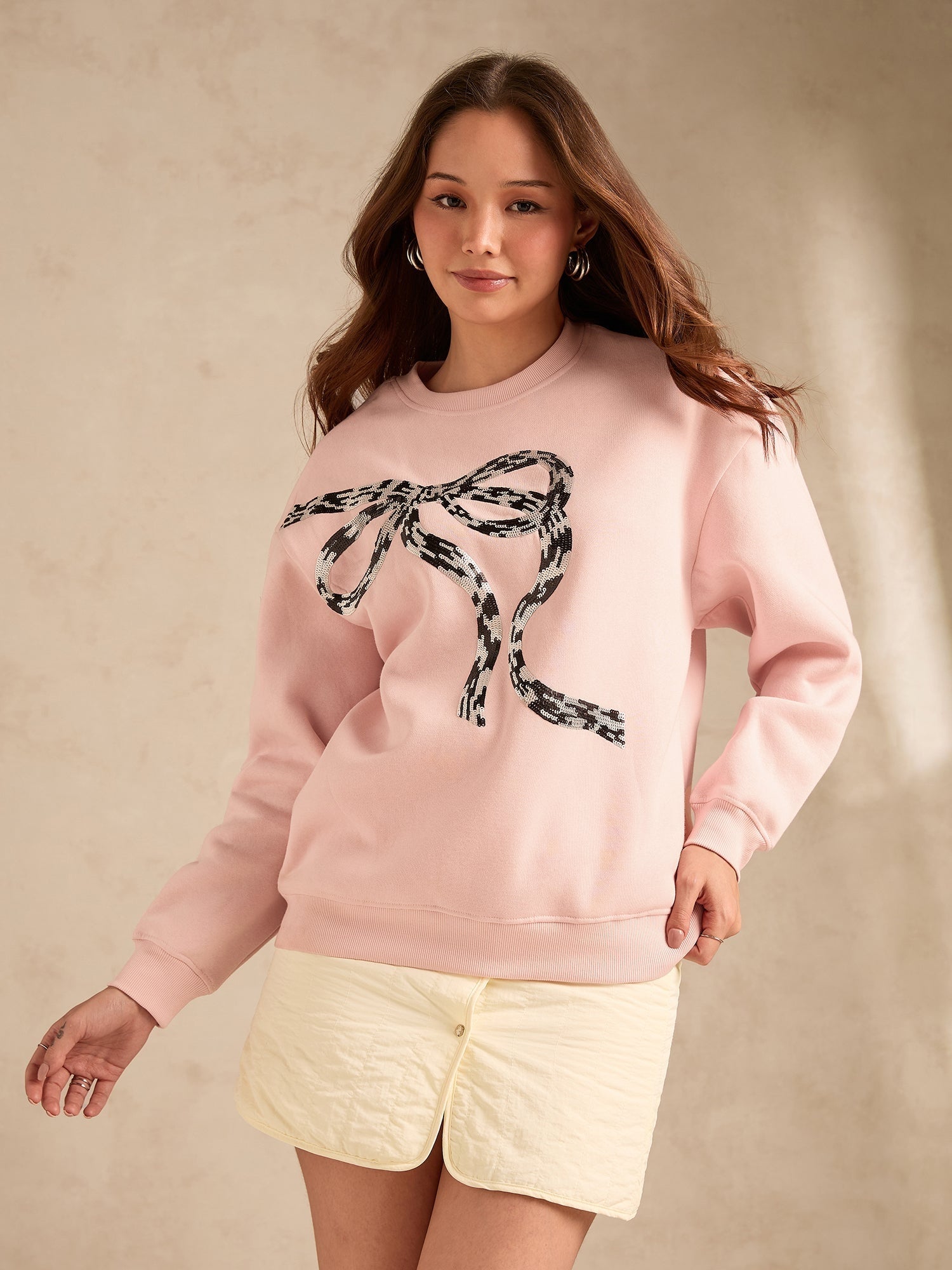 Pink Sequined Bow-Detail Russian Fleece Sweatshirt