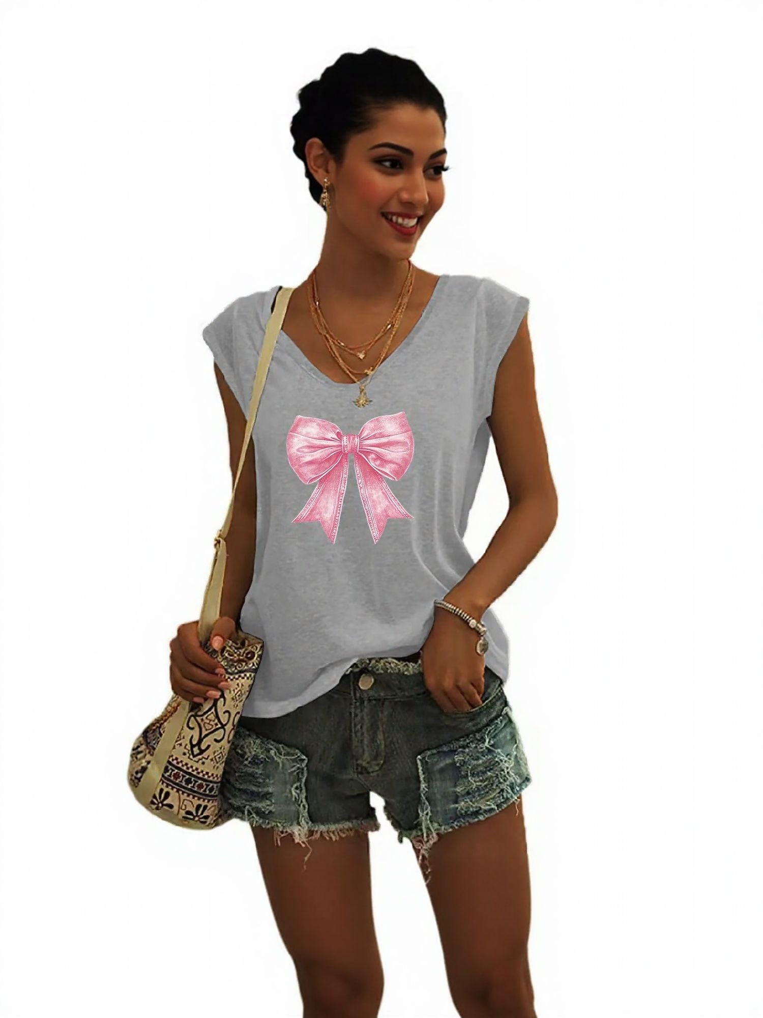 Grey Bow Print Cap Sleeve Grpahic Tshirt