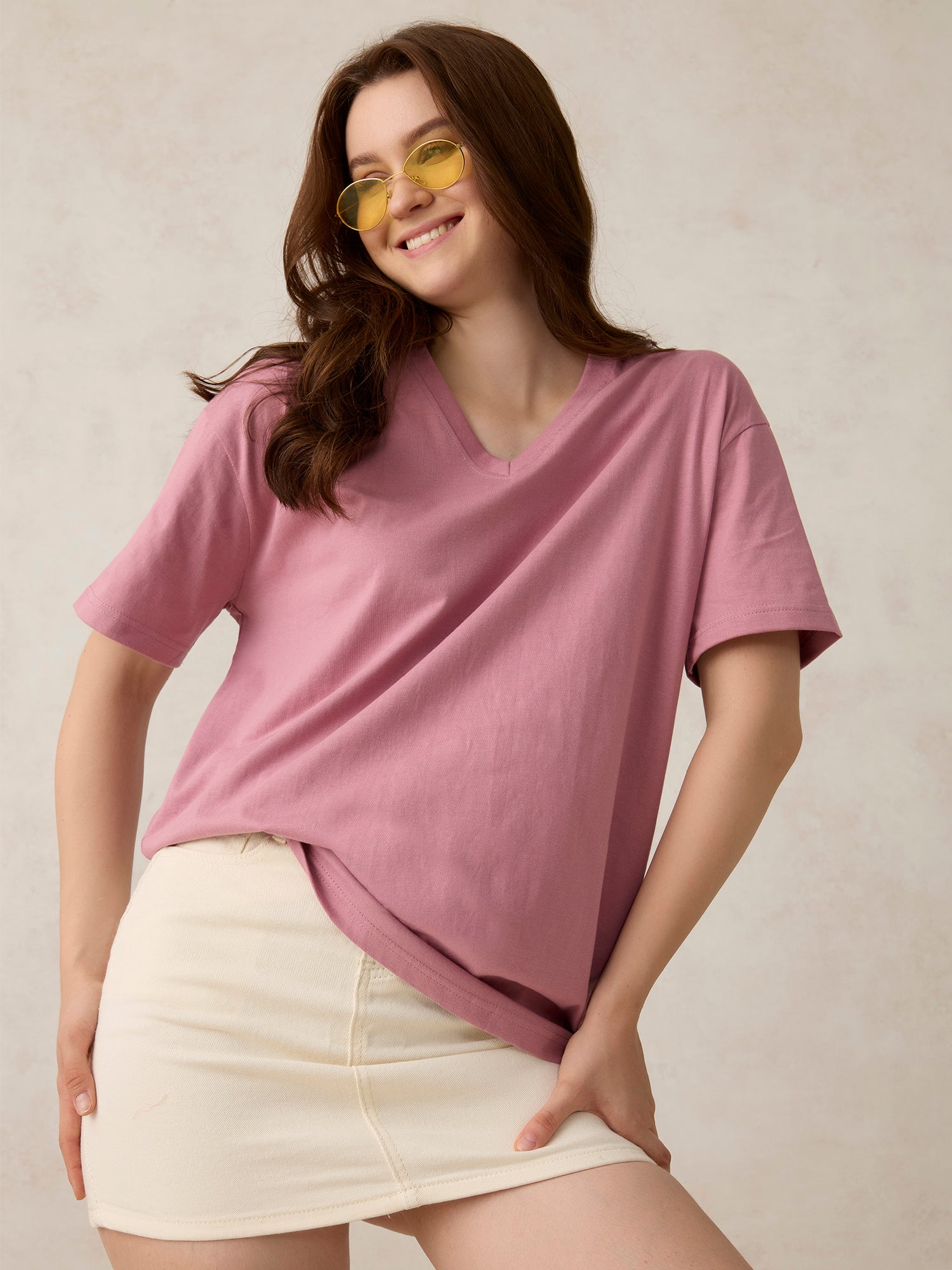 Heading out? The Pink V Neck Solid Oversized T-Shirt has your back. The pink shade gives it a standout look, and its oversized silhouette makes it ideal for everything from casual hangs to chill parties. Pair with your go-to kicks and you're good to go.