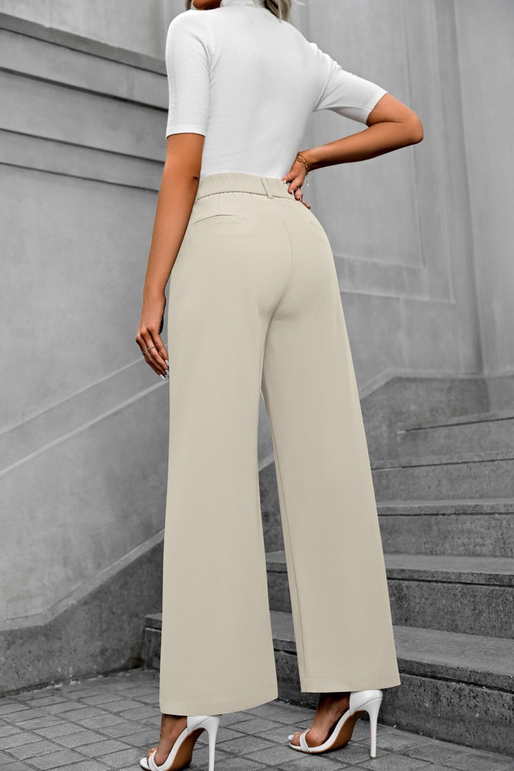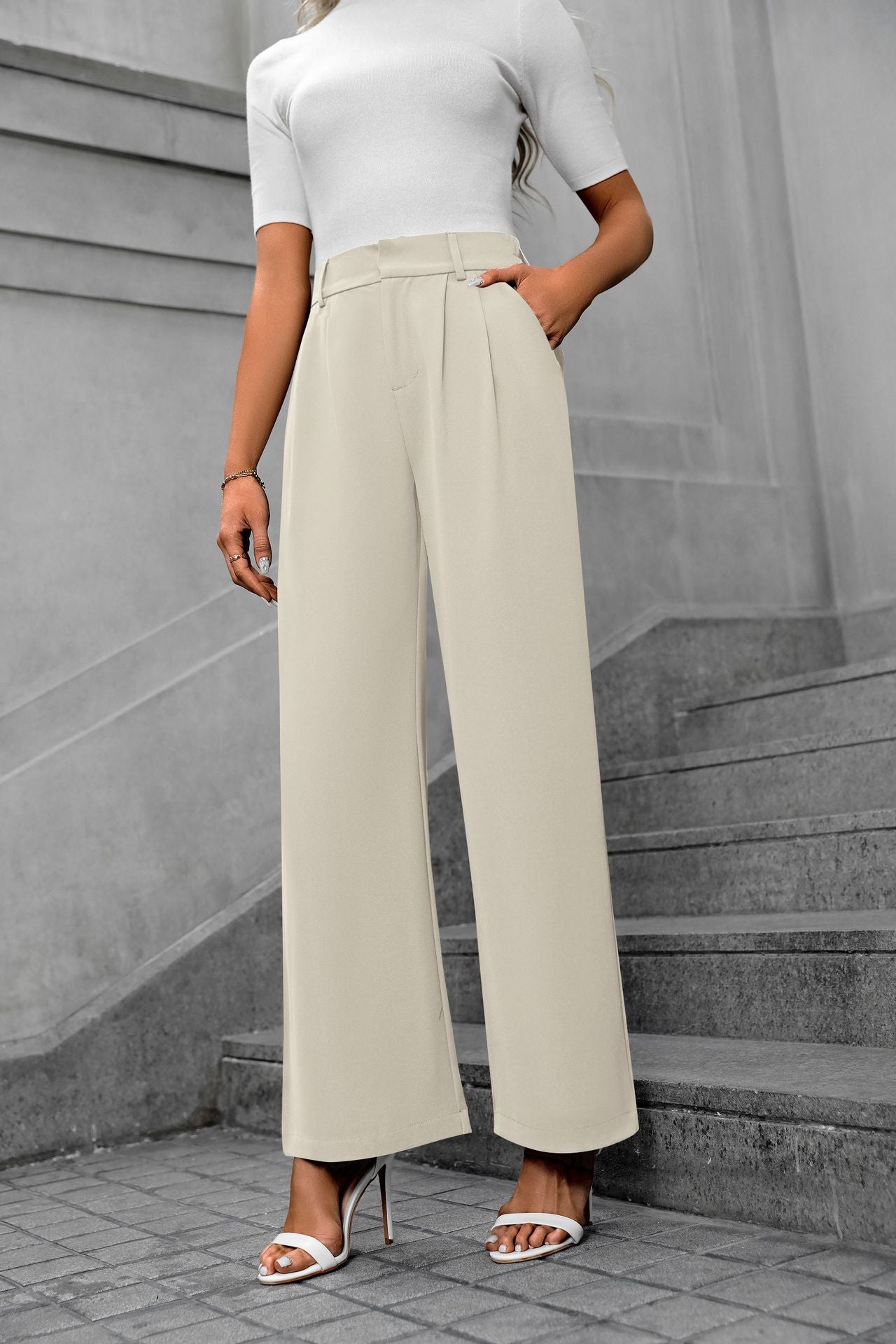 Cream Waist Band Pleated Straight Fit Pants