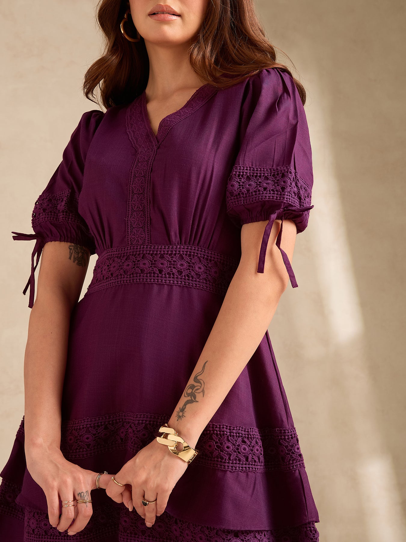Purple Tiered Mini Dress With Lace Inserts Detailing