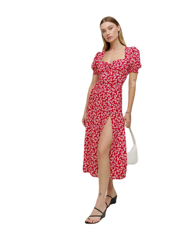 Red Sweetheart Neckline Printed Puff Sleeves Dress