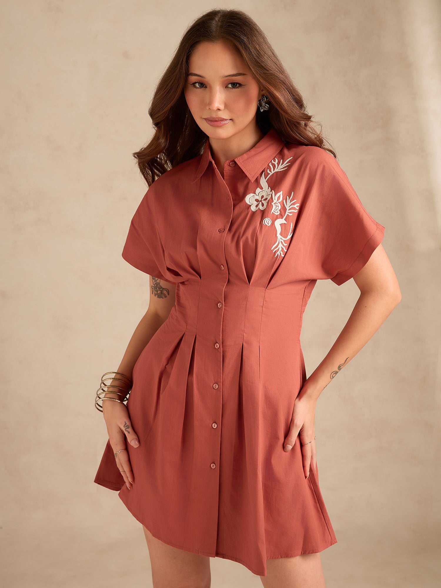 Rust Dolman Fit Printed Shirt Dress With Belt Detail