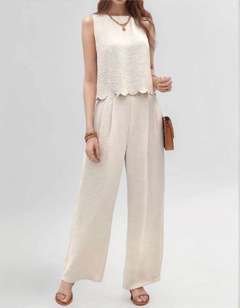 Off White Sleeveless Scallop Hem Back Tie Top Up And Pant Set