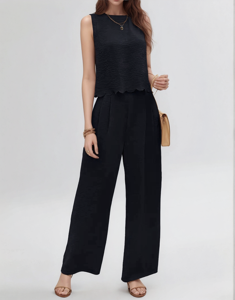 Black Sleeveless Scallop Hem Back Tie Top Up And Pant Set