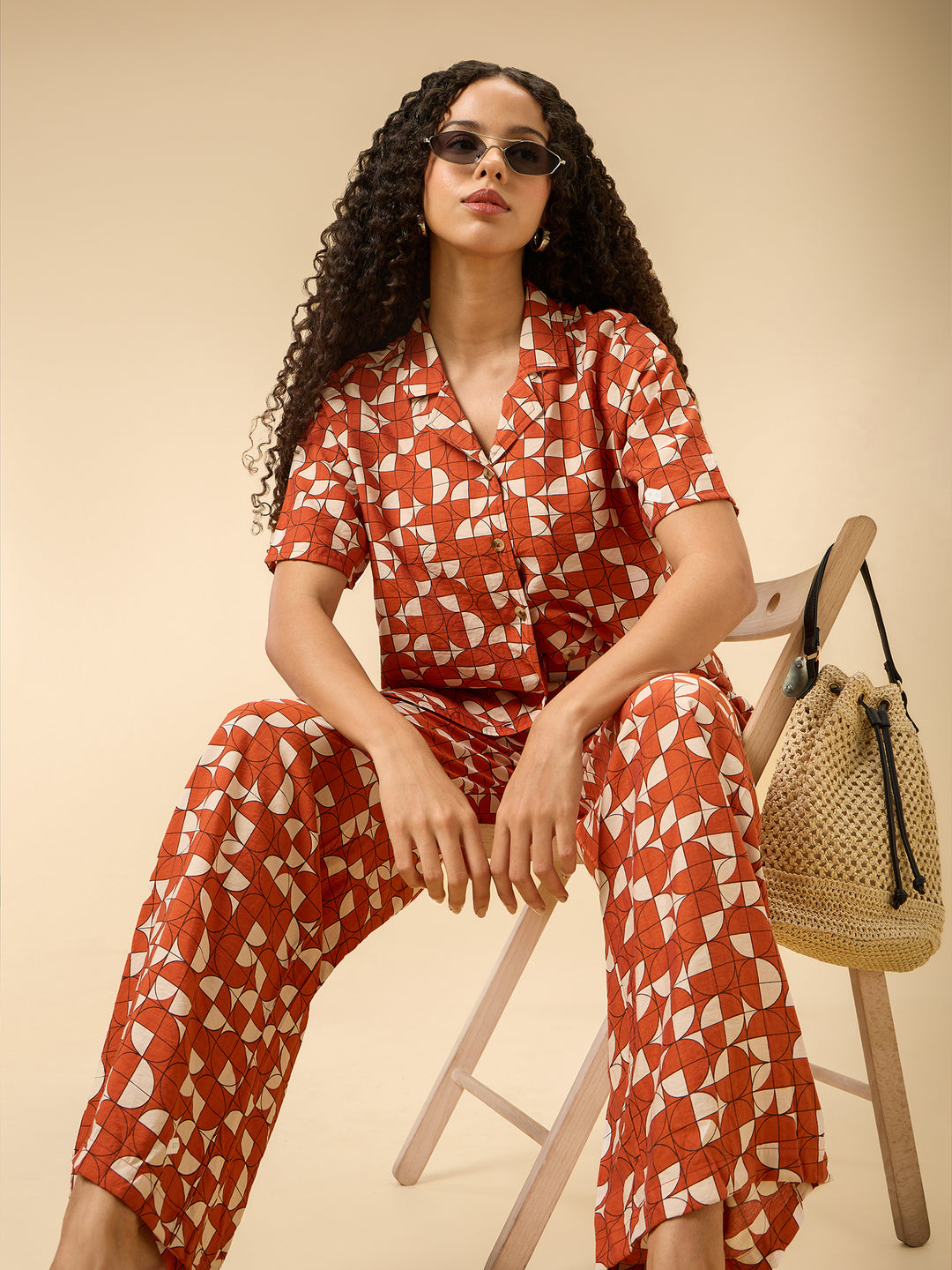 Rust Embellished Coord Set With Oversized Shirt And Wide Leg Trouser