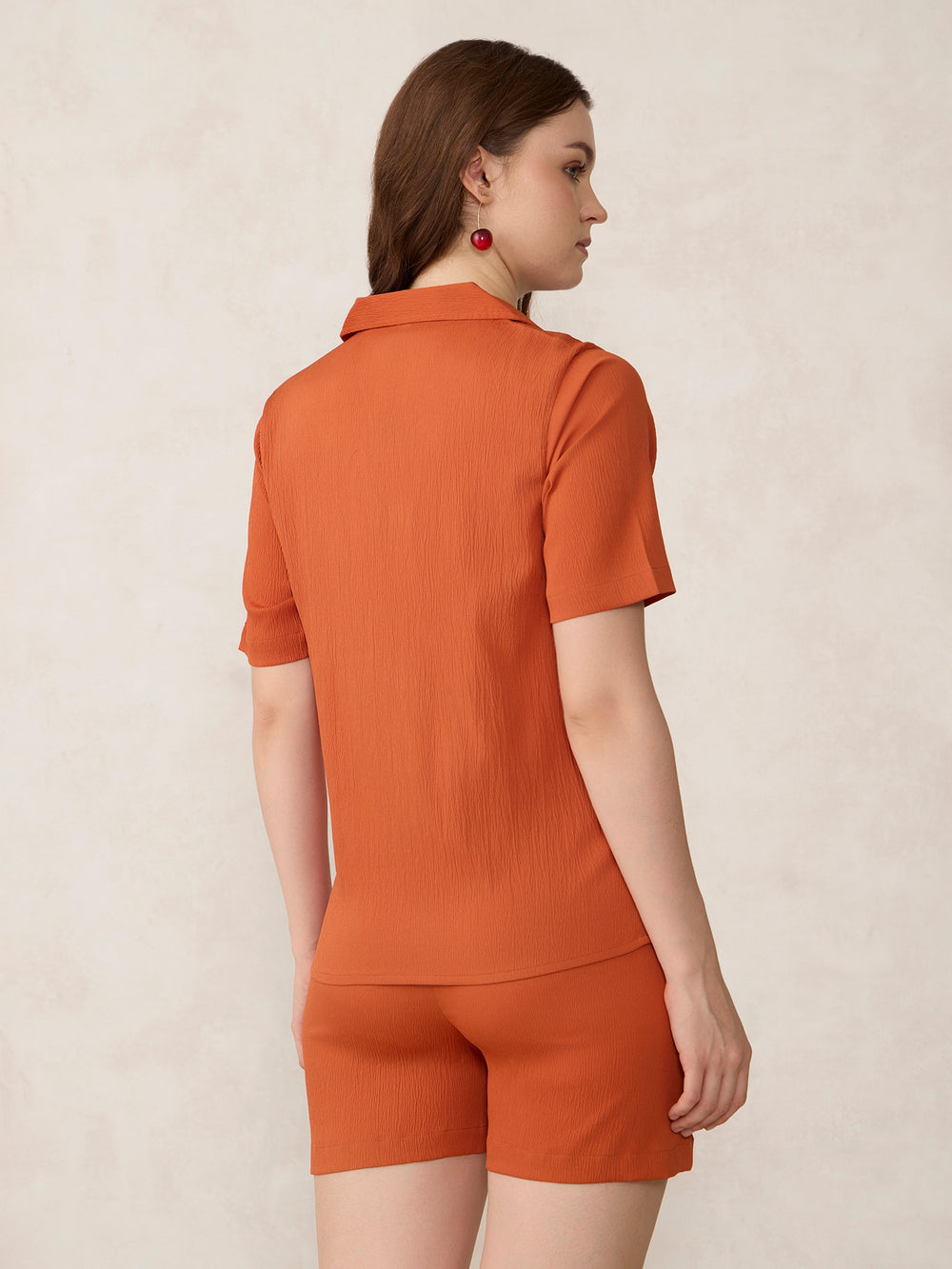 Add a pop of color to your wardrobe with Outzidr's Orange Shirt and Pant Co-Ord Set. Crafted from lightweight woven fabric, this stylish set offers a comfortable fit, making it perfect for casual outings and vacay vibes. A bold and versatile pick for women who love chic co-ords!