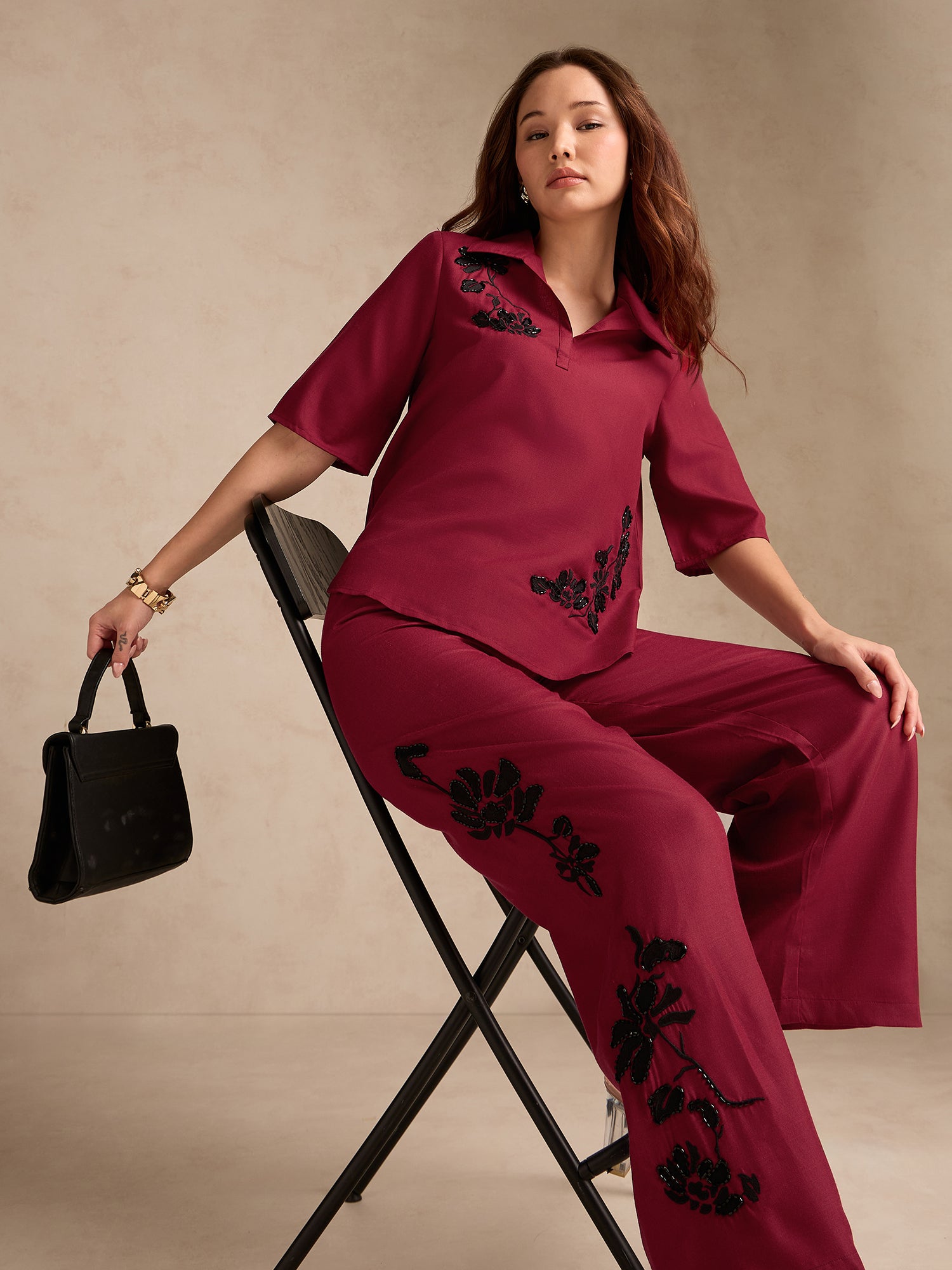Red Coord Set With Relaxed Fit Embroidered Top & Wide Leg Trouser