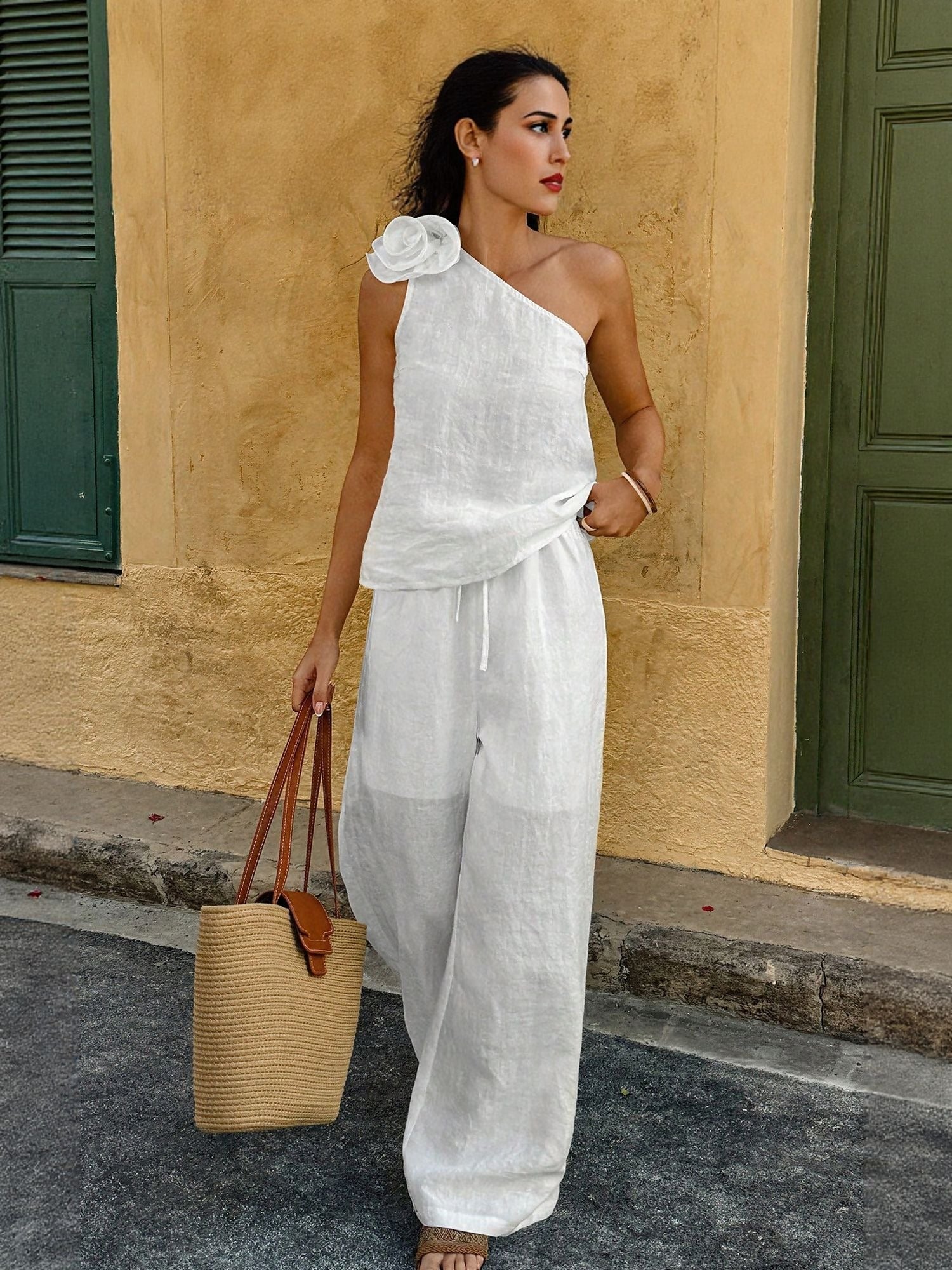 White One Shoulder Corsage Top With Wide Leg Trouser Coord Set