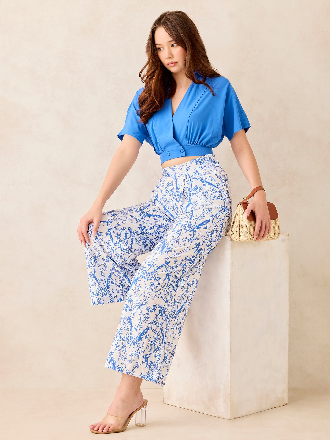 Blue Solid Top With Printed Wide Leg Trouser Coord Set