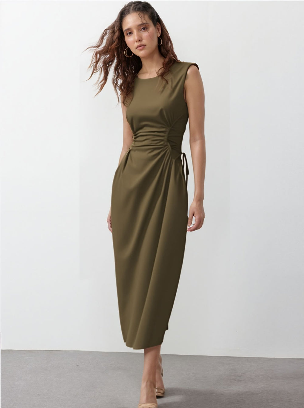 Achieve a flattering silhouette with this green elasticated cinched-waist dress. This chic daily wear piece is perfect for botanical garden visits or a relaxed brunch. Its feminine green hue and comfortable fit also make it an ideal choice for a casual office environment.